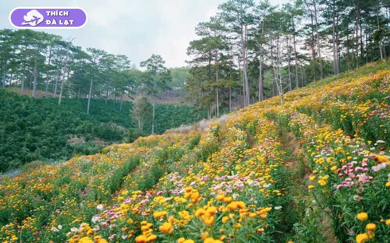Với diện tích hơn 6.000 m², hoa trồng theo triền đồi như ruộng bậc thang, bao quanh là rừng thông. Mùa hoa đẹp nhất từ tháng 2 đến tháng 3, không gian mộc mạc và giá vé rẻ mang đến trải nghiệm gần gũi, khác biệt so với nhiều làng hoa khác ở Đà Lạt.